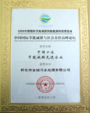 2009年3月在胡錦濤、溫家寶等中央領導出席的中國國際節(jié)能減排與新能源科技博覽會和高峰論壇上評為“中國十佳節(jié)能減排先進企業”。
